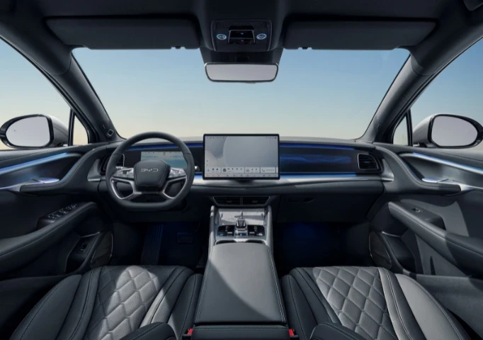 Sink into the soft vegan leather that covers 80% of the interior, creating a lavish and comfortable environment. The adaptable ambient lighting sets the perfect mood for any journey, while the head-up display and panoramic roof provide a truly immersive driving experience. Indulge in the ultimate luxury with the BYD Sealion 7.