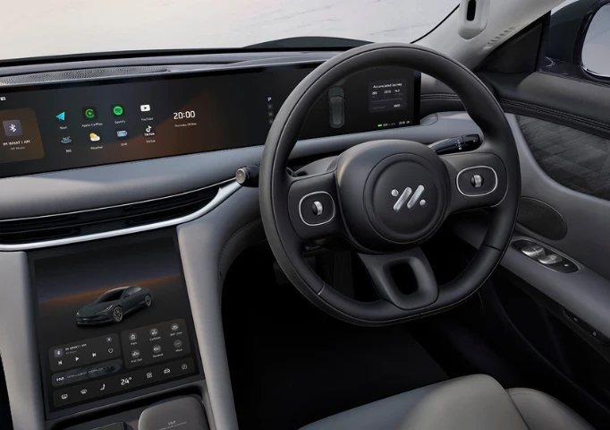 Inside, the IM5 presents a serene, minimalist cabin space filled with high‑end touches. A sweeping 26.3‑inch full‑HD digital dashboard seamlessly connects to a 10.5‑inch touchscreen running MG’s iSmart system. A premium 20‑speaker ceiling‑mounted audio system delivers immersive sound, while heated/ventilated front and rear seats, massage function, double‑glazed panoramic roof, ambient lighting and noise‑cancellation combine to create a calm and luxurious environment. The cabin also includes tech‑smart features such as keyless entry, vehicle‑to‑load power, and intuitive One Touch iAD automated parking modes.